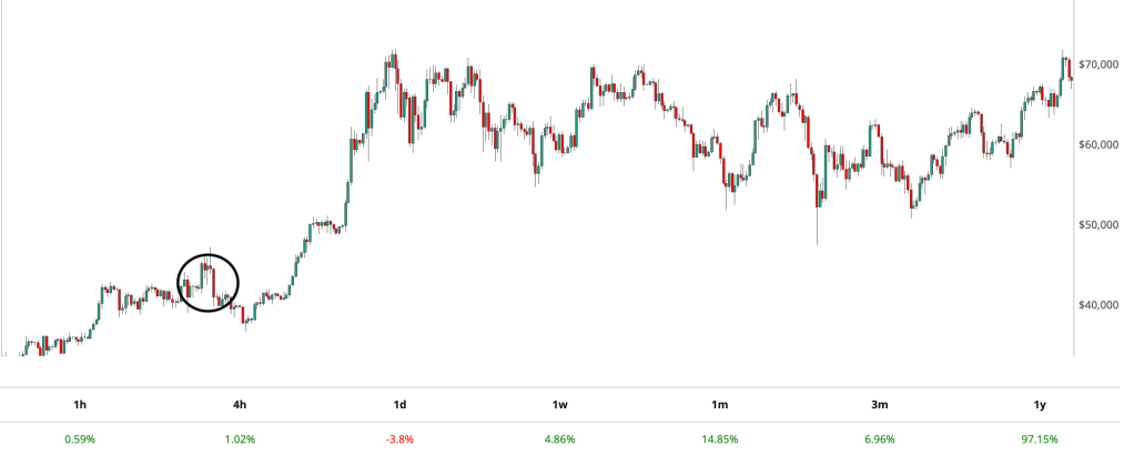 Now over the last week or so, Bitcoin came within pennies of a new all time high. Since then, it has dipped once more but is still relatively stable around this 70k range.