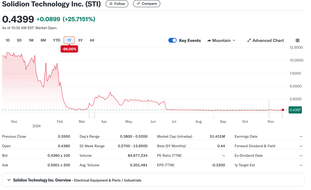 I saw on X today that Solidion Technology – a US based company that produces battery technology – just announced their plans to convert something like 60% of their cash flow into bitcoin with the intention of keeping it as a bitcoin treasury for the company. Below is their stock over the last year: