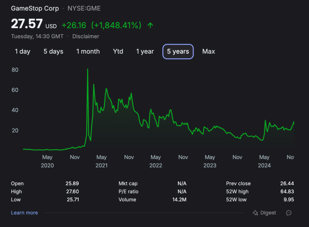 As the price surged, short sellers (mainly Wall Street) faced significant losses, forcing them to buy back shares to cover their positions which further inflated the price in a feedback loop known as a short squeeze (the first sharp spike upwards on the chart above).