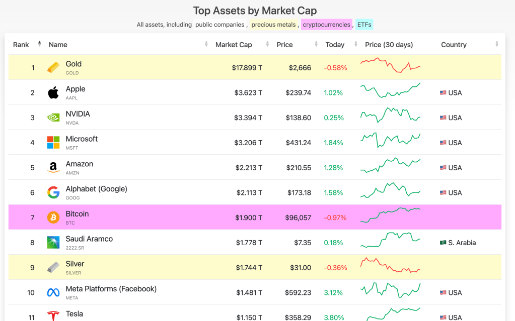 The US has just moved around 20,000 BTC that they had seized from Silk Road. The US holds around 210,000 BTC (all of it seized) and they have been moving a of their confiscated holdings as of late. Every time they move the bitcoin, the price tends to dip as the the market gets scared off. It was also notable that after Trump had announced his intention to launch a Strategic Bitcoin Reserve in July of this year, there were rumours that the current administration was going to sell it off. This never happen, but I remember it being a distinct possibility at one point. But I think the time for that has now passed. It is clear that the future lies with Bitcoin – it is clearly the best performing asset and is currently the 7th largest asset in the world:
